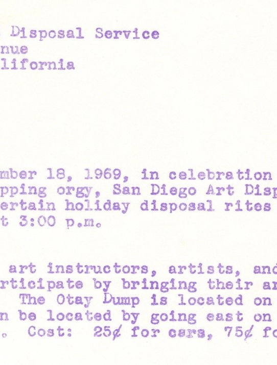 Good humor is at the forefront of his collaborative intermedia performances, which include operating the San Diego chapter of the Art Disposal Service. After signing a contract with the organization's Los Angeles headquarters in July of 1969, Matheny issued a press release (notices were subsequently published in the newspapers) and prepared for "holiday disposal rites" that December at the Otay dump. (figures 11,12, 13)